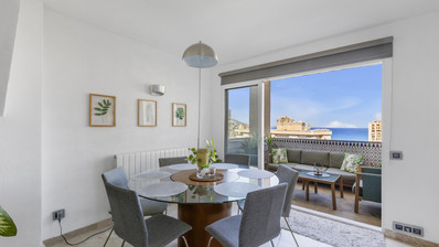 A spacious and bright living room with large windows that open onto a terrace with a beautiful view of the Mediterranean Sea. It is the perfect place to relax with your morning coffee or dinner overlooking the sea.