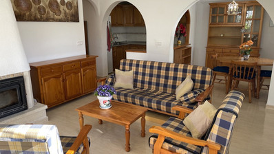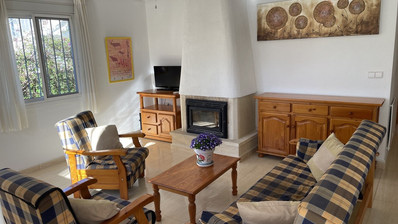 A very well maintained, south facing, 2 bedroom, 2 bathroom detached Rosa model villa with air-conditioning, fireplace, solarium, under-build and a beautiful mature garden on the final phase of Camposol in Mazarron, Murcia. Situated on a plot of 400 sqm and with a living space of 93 sqm, the property is located on a quiet residential street.Upon entering the property, you have a front sunny terrace that is half glazed and half open with sliding doors, windows, awning and fly-screens. The light and airy open plan lounge has a wood burning fireplace, ceiling fan and dual air-conditioning with an archway to dining area and a fully fitted kitchen with wooden upper and lower units, plenty of work surfaces, oven, hob and extractor fan and comes complete with all white goods. The kitchen has the bonus of a close-in boiler that offers instant hot water. Two double bedrooms, the master bedroom has an en-suite fully tiled bathroom with bath and overhead shower, sink, bidet and cupboard unit. There is a further tiled bathroom with an enclosed shower unit adjacent to the other bedroom and this also houses the washing machine. Both bedrooms have ceiling fans and fitted wardrobes.The beautiful mature garden has many lovely plants, trees and shrubs including mango, peach and olive to name a few. The water is fully irrigated and can operate on a timer. There is a good size 3 x 4 shed plus further storage under the stairs to the solarium and off-road parking. The large solarium, with storage, affords great views to the surrounding mountains. The property is being sold furnished and with all white goods. The large under-build, which is 6 foot high and currently used as storage, could be converted to a games room or as further accommodation if one wished. The property has fly-screens and panel heaters throughout plus 3 solar panels on the solarium.Camposol is located 15 minutes from the blue flag beaches of Puerto de Mazarron and Bolnuevo. The international airport at Corvera in Murcia is just 20 minutes away and Alicante airport 70 minutes. In addition to the 18 hole golf course within Camposol, there is the Jack Nicklaus Signature course 10 minutes away in Alhama de Murcia.Camposol has a selection of shops, bars, restaurants, banks, dentists, health clinic, cultural centre, petrol station and lots of activities for adults and children. Camposol is divided into four sectors, A, B, C and D with approx. 4,000 properties spread across these sectors. You have two Commercial Centres on A and B, where you will find all the bars, restaurants and entertainment.