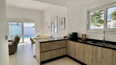 Beautiful modern detached villa on a corner lot in Benijofar. Located on a spacious corner plot of over 400 m², this beautiful modern villa offers a unique combination of privacy, openness, and comfort. Whether you are looking for a permanent home, a stylish vacation home, or a high-quality investment on the Costa Blanca, this property meets all expectations.From the very first moment, the sleek, modern architecture catches the eye. Large windows, minimalist lines, and a harmonious mix of high-quality materials create a light and elegant look.The property is designed entirely on one level, ensuring optimal living comfort and a seamless transition between indoor and outdoor spaces, ideal for those who love convenience and a modern Mediterranean lifestyle.Layout of the house3 spacious bedrooms with lots of natural light and built-in wardrobesA stylish master suite with direct access to the garden and pool2 modern bathrooms with high-quality finishes and a luxurious, spa-like feelA bright open-plan living room that maximizes space and lightA fully equipped modern kitchen with generous countertopsLarge sliding doors to the terrace for a perfect indoor-outdoor experienceThe living space forms the heart of the home and is perfect for both cozy family gatherings and relaxing evenings in peace and quiet.