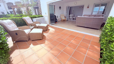 Beautiful Sunny Ground Floor Golf End Apartment. Stunning Ground Floor End Apartment with Garden & Golf Views – Upgraded & Move-In ReadyWe are delighted to bring to the market this fantastic large ground floor end apartment, perfectly positioned to enjoy sunshine all day and beautiful golf course views. Ideally located within the lovely hacienda Riquelme Golf resort with 24 hour security resort, the property is just a 2-minute walk to the communal pool and within easy reach of the on-site restaurant, coffee shop and supermarket. The vibrant town of Sucina is only a 5-minute drive away, offering a wide selection of bars, restaurants and everyday amenities. The apartment is also conveniently located just 20 minutes from Murcia International Airport, making it ideal as a holiday home, permanent residence or rental investment.Upon entering this beautiful and highly sought-after curved wall apartment, it is immediately clear how well the current owners have cared for the property.The home features a fully upgraded wrap-around white kitchen with quality worktops, an abundance of storage, and high-quality integrated appliances.The spacious lounge and dining area is bright and airy, with three large windows and bi-fold doors that flood the room with natural light, with bespoke curtains and roman blinds. The living area also benefits from gas central heating radiator, air-conditioning and is being sold fully furnished (excluding personal items).The bi-fold doors open onto a bright covered terrace, one of the largest on the resort, designed perfectly for entertaining. This stylish outdoor space includes:Ultra-modern storage unitsQuality worktopsWine chiller fridgeHigh-quality seating and dining tableUpgraded floor tilesBespoke fitted blindsFolding glass curtains allowing year-round useWhen fully opened, the glass curtains create a seamless indoor-outdoor living space leading onto a tiled sun terraceoverlooking the communal gardens and golf course. The terrace also includes a custom air-conditioning cover with white aluminium and granite worktop, beautiful terrace and ideal for sunbathing, breakfast in the sun or evening drinks.The large family bathroom features an elegant arched window, full bath with glass shower screen and overhead shower, upgraded white vanity unit with mirror, WC, mirrored storage unit, and a heated towel radiator.The master bedroom includes mirrored sliding wardrobes, air conditioning, gas radiator, and patio doors leading to a private terrace, perfect for enjoying a morning coffee while taking in the peaceful surroundings.The guest twin bedroom also benefits from patio doors opening onto a front balcony, mirrored wardrobes, air conditioning, and a fitted mirrored wardrobe.Additional features include:&10004; Private underground parking space&10004; Secure remote-controlled access to the garage&10004; Elevator access from the garage&10004; Fully furnished (excluding personal items)&10004; Excellent transport links to explore the Costa Cálida regionThis exceptional apartment must be seen to fully appreciate the space, upgrades and quality throughout.