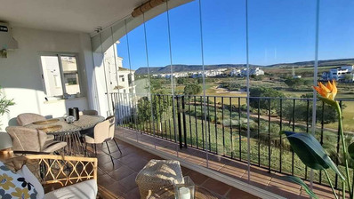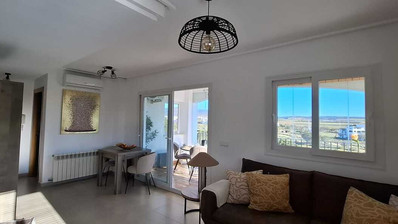 This well presented second floor corner apartment has glass curtain on the large main terrace with stunning views over the resort.The curevd wall design means this apartment has a large kitchen which has been upgraded. The bathroom has a window and been modernised with a walk in shower.Both bedrooms have wardrobes and patio doors leading the back terraces.The property has air-conditioning in the living room for summer and central heating for the cooler winter months. There is private underground parking and storage, with an elevator to all levels. The apartment is being sold furnished minus personal possessions. It would make an excellent holiday home or suitable for permanent living.The first thing that impresses you about Hacienda Riquelme Golf Resort is the wide-open spaces, the extensive gardens and the low-density construction, which create a relaxing environment to enjoy a very safe and peaceful life or holiday. The apartments are set out spaciously around the magnificent and challenging 18 hole golf course part of the Jack Nicklaus Golf Trail. In the heart of the resort you will find the beautiful renovated Hacienda where you will find a supermarket, clubhouse, restaurant and bar. The inner court yard becomes the hive of entertainment in the Summer, whilst the large terrace set in the stunning gardens is open all year for “al fesco” dining and drinking.Facilities:Gated Community.24 hour security."El Cason" Bar, Restaurant, Clubhouse. "Sips" Coffee ShopSupermarket.Summer Entertainment.19 large community swimming pools.Communal gardens.Trees, 5 lakes.Wild flowers & local wildlife.Driving range & Golf ShopTennis courts.Paddle tennis courts.Football / Basketball court.Outside gym area.Children's play areas.Hacienda Riquelme is very well connected by the main motorways. Murcia Airport (20 mins)Mar Menor beaches (15 mins)Mediterranean beaches (20 mins)For those who like historical buildings, architecture or a desire to shop, the lovely cities of Murcia and Cartagena provide plenty of entertainment. Murcia (30 mins)Cartagena (45 mins) Murcia Airport (20 mins)Near to the bustling popular village of Sucina with shops, restaurants, bars, chemist, supermarket and lots more (5 minutes)For more information on the apartments available please contact us.